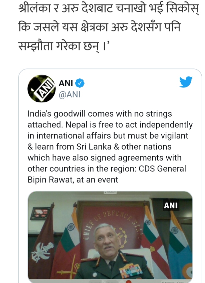 भारतको तीन वटै सेनाका प्रमुख अर्थात् चीफ अफ डिफेन्स स्टाफ (सीडीएस) जनरल बिपिन रावतले नेपालको नाम लिँदै श्रीलंकासँग सिकोस् भन्नुभएको हो । नेपालले श्रीलंका र अरु देशबाट सिक्नुपर्ने सीडीएस जनरल रावतको भनाइ थियो ।