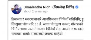 यिनै विषयलाई समेटेर नेता निधिले फेसबुकमा लेखेका थिए । ‘हिमालय र सगरमाथाबारे आपत्तिजनक चिनियाँ गतिविधि, हुम्ला, रसुवा, संखुवासभा, सिन्धुपाल्चोक गरि ३३ हेक्टर जग्गा चीनद्वारा कब्जा, गोरखाको रुई गाउँ कब्जा, कोरोनाबारे सहयोग र चिनियाँ भाषा पढाउने नाउमा चिनियाँ सेना आउने र सरकारलाई चिनियाँ पार्टीले तालिम लिएको समाचार आयो । सरकारको जवाफ चाहिँयो !’