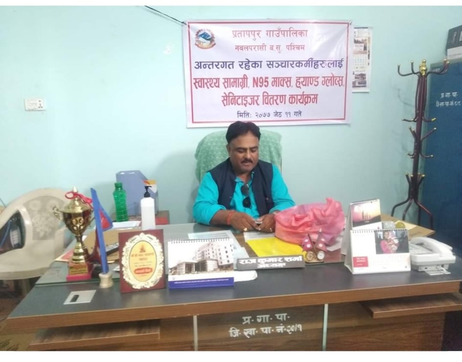 – पश्चिम नवलपरासीको प्रतापपुर गाउपालिका द्वारा क्रियाशिल पत्रकारहरुलाई सुरक्षा सामाग्री उपलब्ध गराएको छ । गाउपालिका क्षेत्रभित्रका ७ जना क्रियाशिल पत्रकारहरुलाई सुरक्षा सामाग्री उपलब्ध गराएको हो । जिल्लामा कोरोना भाईरसको संक्रमितको संख्या बढे पछि संक्रमण विरुद्ध लडाईमा अग्रसर भै काम गरिरहेका ति पत्रकारहरुलाई आईतवार १-१ पिस केएन-९५ माक्स, एक पिस ह्यान्ड ग्लोप्स र एक पिस सेनिटाईजर उपलब्ध गरेको गाउँपालिका अध्यक्ष राजकुमार शर्माले जानकारी दिएका छन् ।